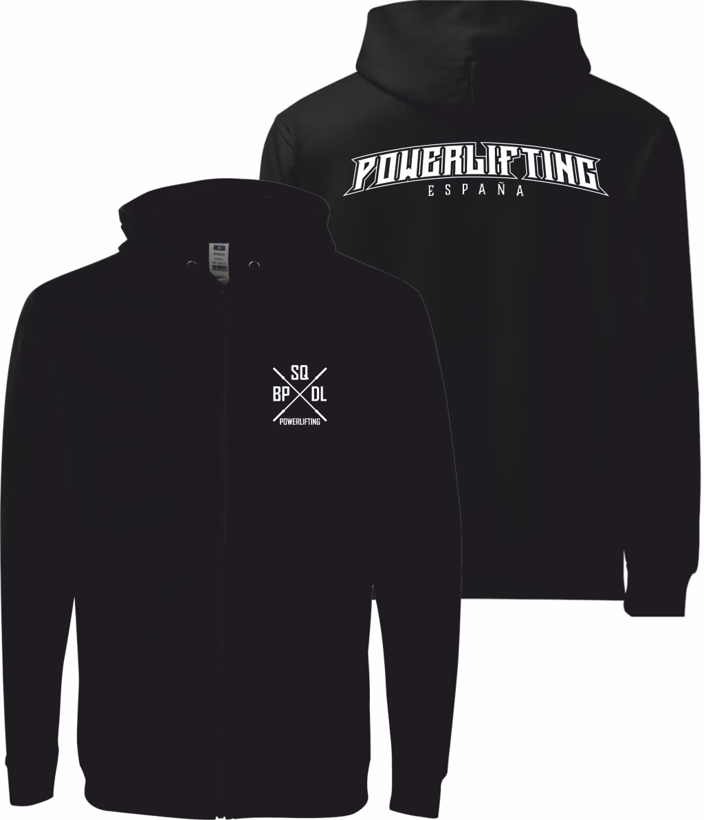 Sudadera negra con bolsillos, cremallera y capucha, diseñada para el día a día del Powerlifter dentro y fuera del gimnasio. Funcional, sobria y con identidad clara.